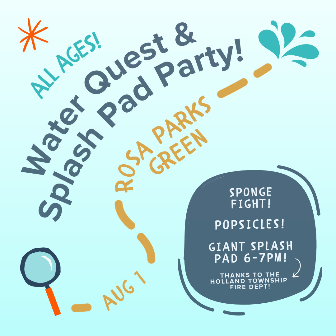 Join us for Water Quest & Splash Pad Party at Rosa Parks Green, an evening designed for water fun and time together in the neighborhood! Activities will include a slip & slide, bubbles, and a sponge fight to close out the night.